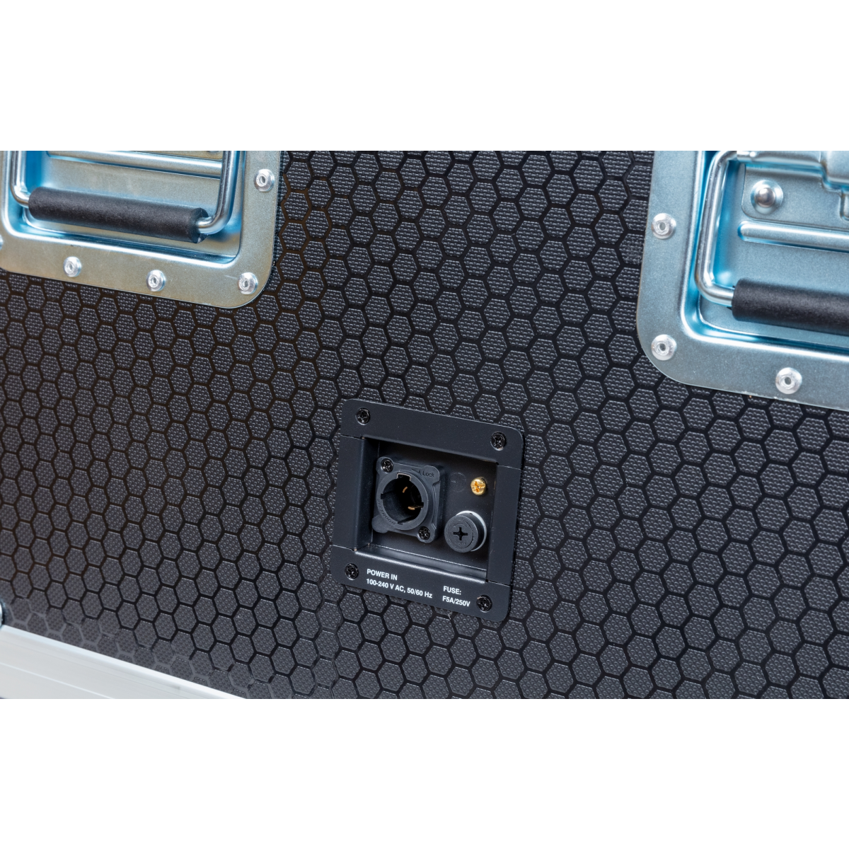 Stackable Wheeled flight case designed for 4 units of Mood Master 18 , featuring a main power inlet, multiple internal power connections, and dedicated compartments for cables and accessories.