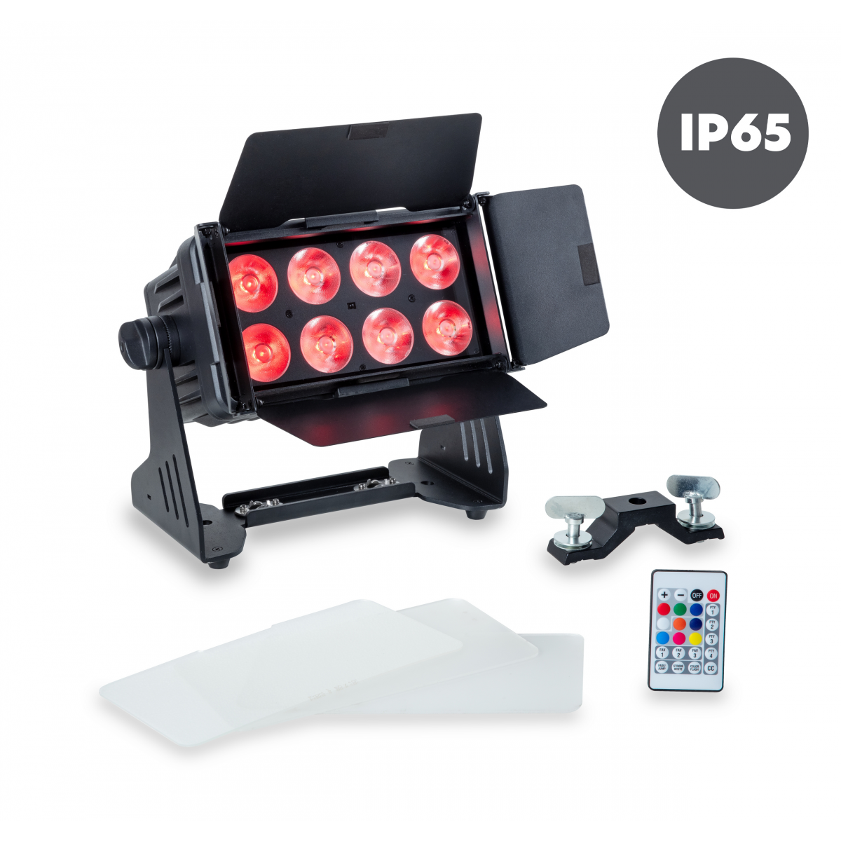 Il dispositivo dispone di 8 LED RGBW 4-in-1 da 15 W, disposti per una distribuzione ottimale della luce, garantendo un'illuminazione potente e uniforme. Supporta molteplici configurazioni di controllo, inclusi i modi DMX a 3, 4, 6, 8 e 11 canali, offrendo flessibilità sia per configurazioni semplici che complesse. Un telecomando a infrarossi con una portata fino a 15 metri consente un facile accesso alle impostazioni, mentre il DMX Wireless integrato CRMX permette installazioni senza cavi.