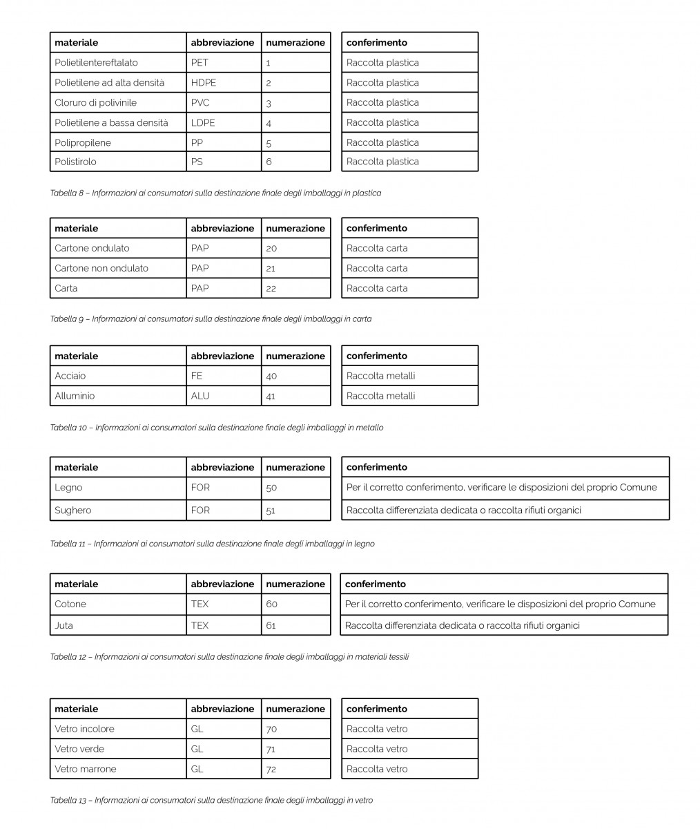 Informazioni per l'identificazione degli imballaggi dei prodotti e per il corretto conferimento alla raccolta differenziata.